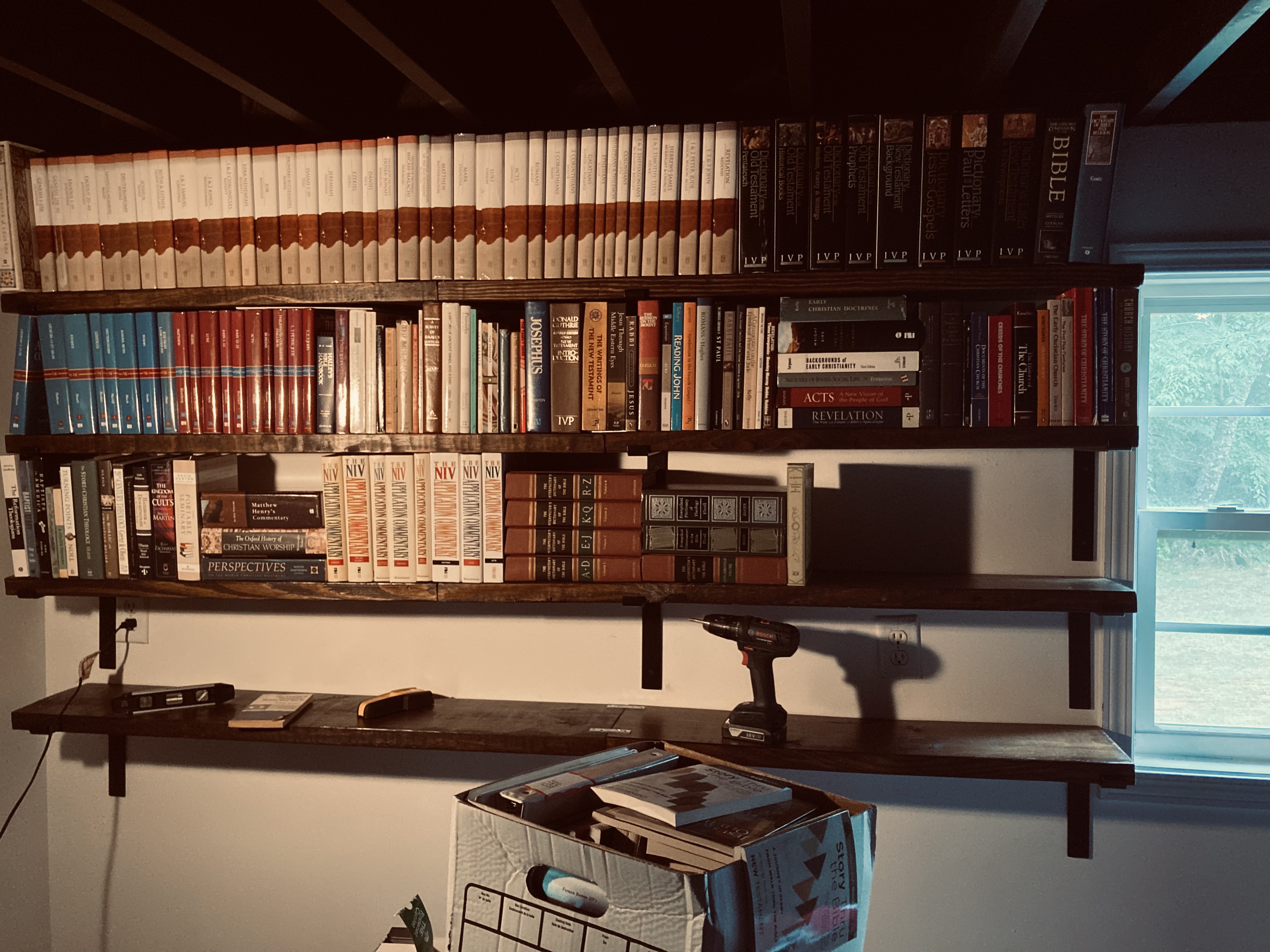 A little over a year ago, I took a job teaching literature at a private school just outside Atlanta. I moved my family into a wise old house in a half-horse town about twenty minutes from the school, and we have spent the past year slowly settling in. Last fall, I hired a guy to drywall and circuit part of the house’s ample, unfinished basement, a space I had determined would make a decent office. From a stack of 10′ x 10″ lumber I’ve fastidiously sanded, stained, and sealed, I’m currently outfitting the walls with book ledges. On these, I’ll be able to store the contents of about thirty banker’s boxes full of books, commentary sets, and teaching files from my years of pastoral ministry. It’s as amateurish a work in progress as ever there was, but it’s coming along.